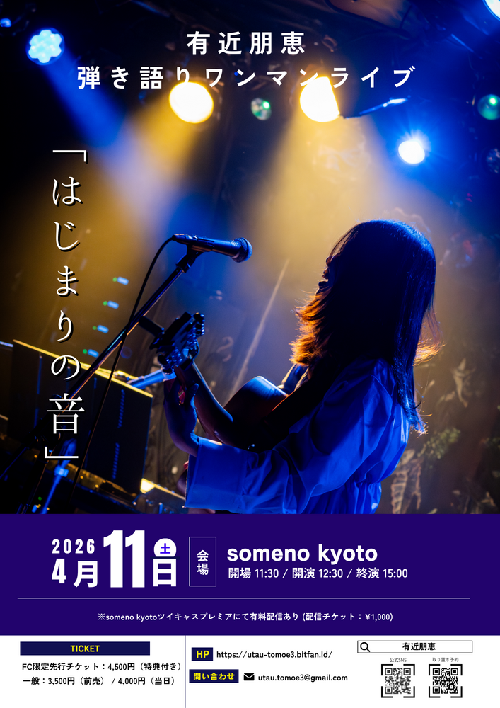 有近朋恵ワンマンライブ 『はじまりの音』 SCHEDULE 2026/04/11(土) 12:30 - 15:00 someno kyoto 地図を表示 open 11:30 / start 12:30 公演概要 ▶︎▶︎詳細はこちら チケット購入 URLをコピーする 報告する